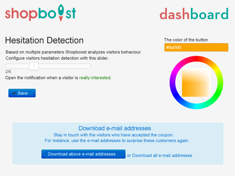 基于多个行为参数,Shopboost检测犹豫。那些犹豫不下订单的游客得到了惊喜。作为web管理员,您可以配置一个惊喜(免费的产品或服务、额外的支持、免费的发货或折扣券,等等)。当一个访客接受了你带来的惊喜时,他会要求你提供一个电子邮件地址(可选的或必须的)。Shopboost还可以自动发送电子邮件提醒到这个电子邮件地址。作为web管理员,您可以从用户友好的仪表板上下载这些电子邮件地址。