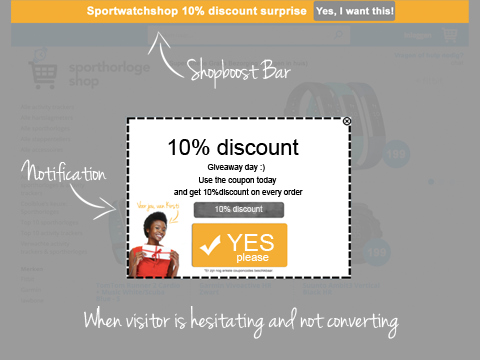 每一家网店都会因为游客不愿意下订单而“吃亏”。客人会在退房时打断客人,留下满满一篮子。访问者在你的网店和竞争对手的网店之间游移不定。他们中的很多人只是需要一点点友好的推动。Shopboost检测到这种行为,并自动提供一个惊喜。这可以是一个免费的产品或服务,额外的支持,免费送货,或优惠券的折扣。通过热情的访问者,你卖得更多。由于先进的犹豫检测系统,你只提供惊喜给游客谁真的需要额外的东西,以便下订单。